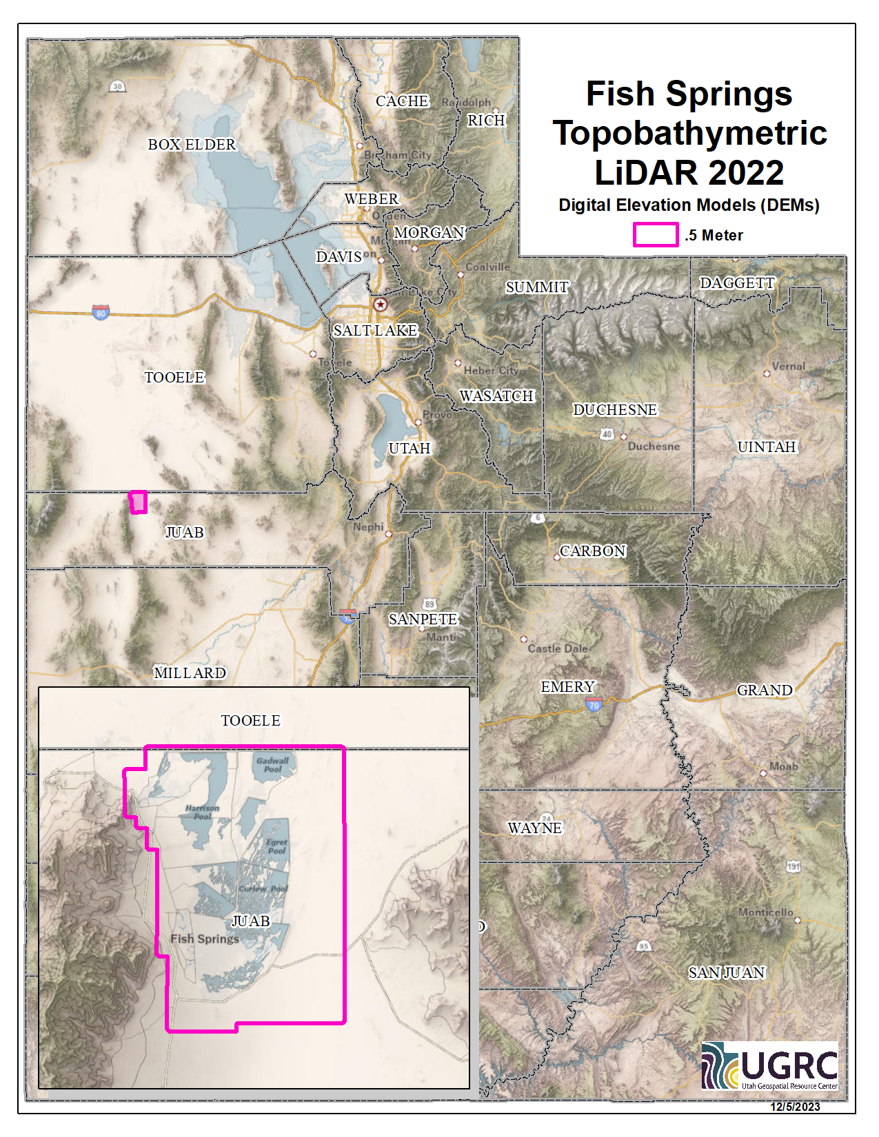 In 2022 the U.S. Geological Survey (USGS) acquired 29.5 square miles of 8 points per meter Quality Level 1 Topobathymetric Lidar of Fish Springs National Wildlife Refuge in Utah. The 0.5 resolution topo-bathy DEMs in .tif format have a 10.0cm vertical RMSE accuracy and are available for download. The LAS point clouds are available from The National Map , opens in a new tab . This elevation data was collected September 24, 2022.